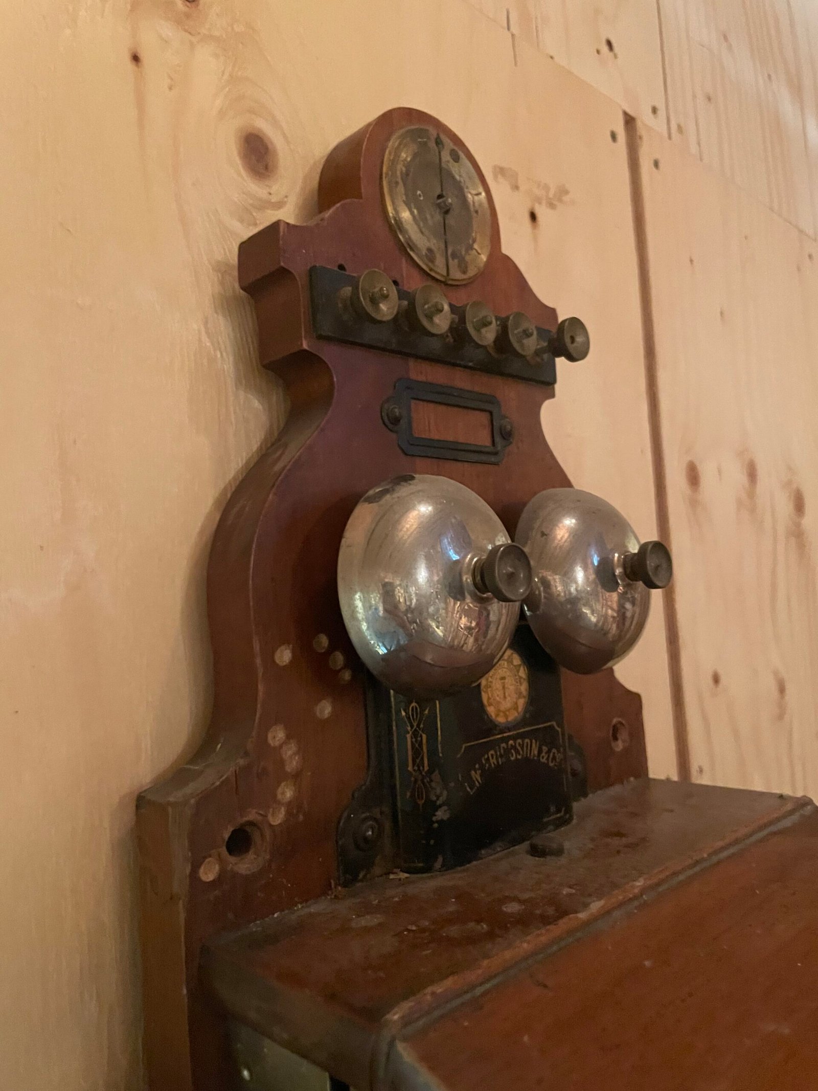Fin äldre  telefon med ett lite lönnfack som man ser på bilden.