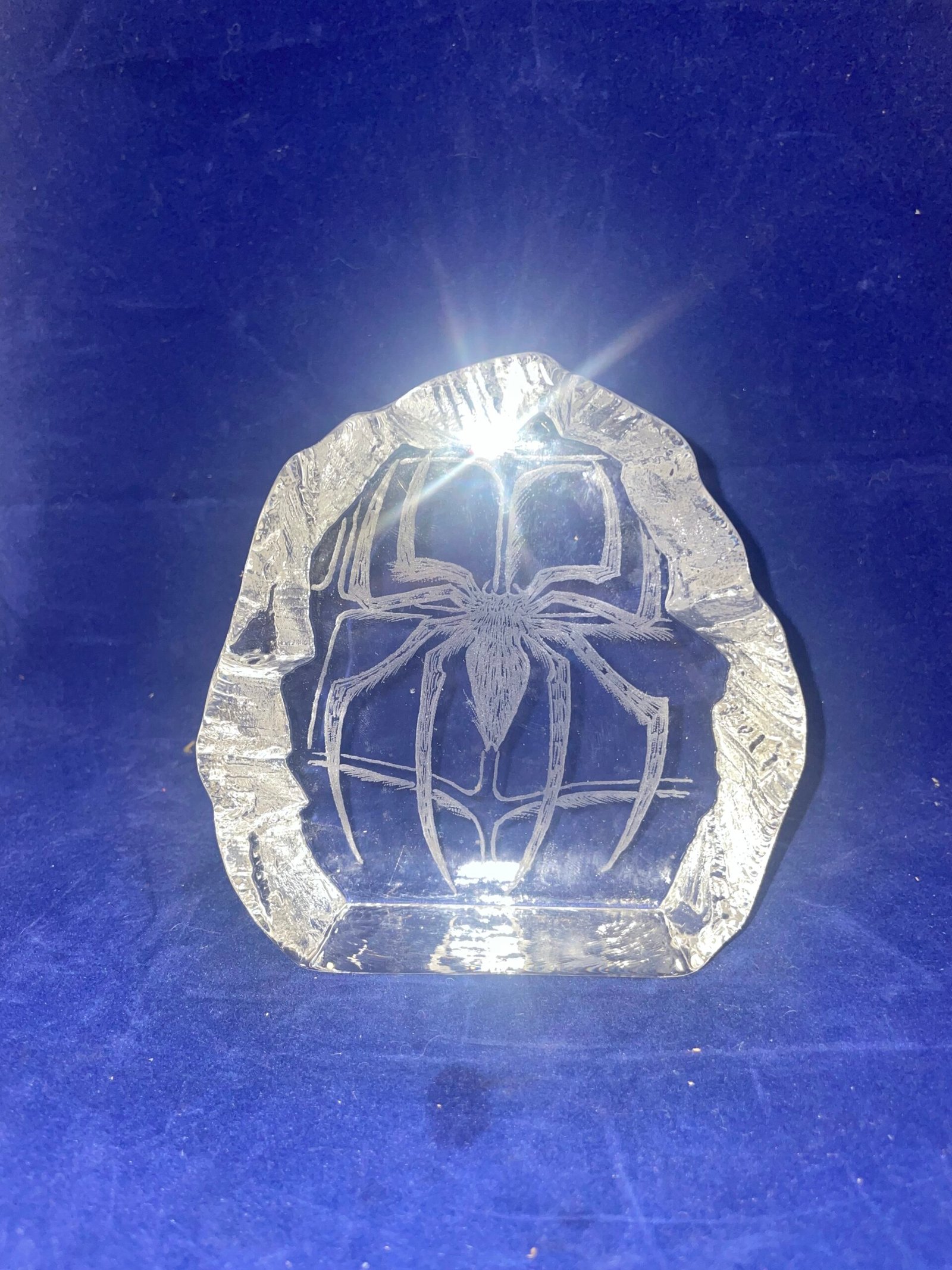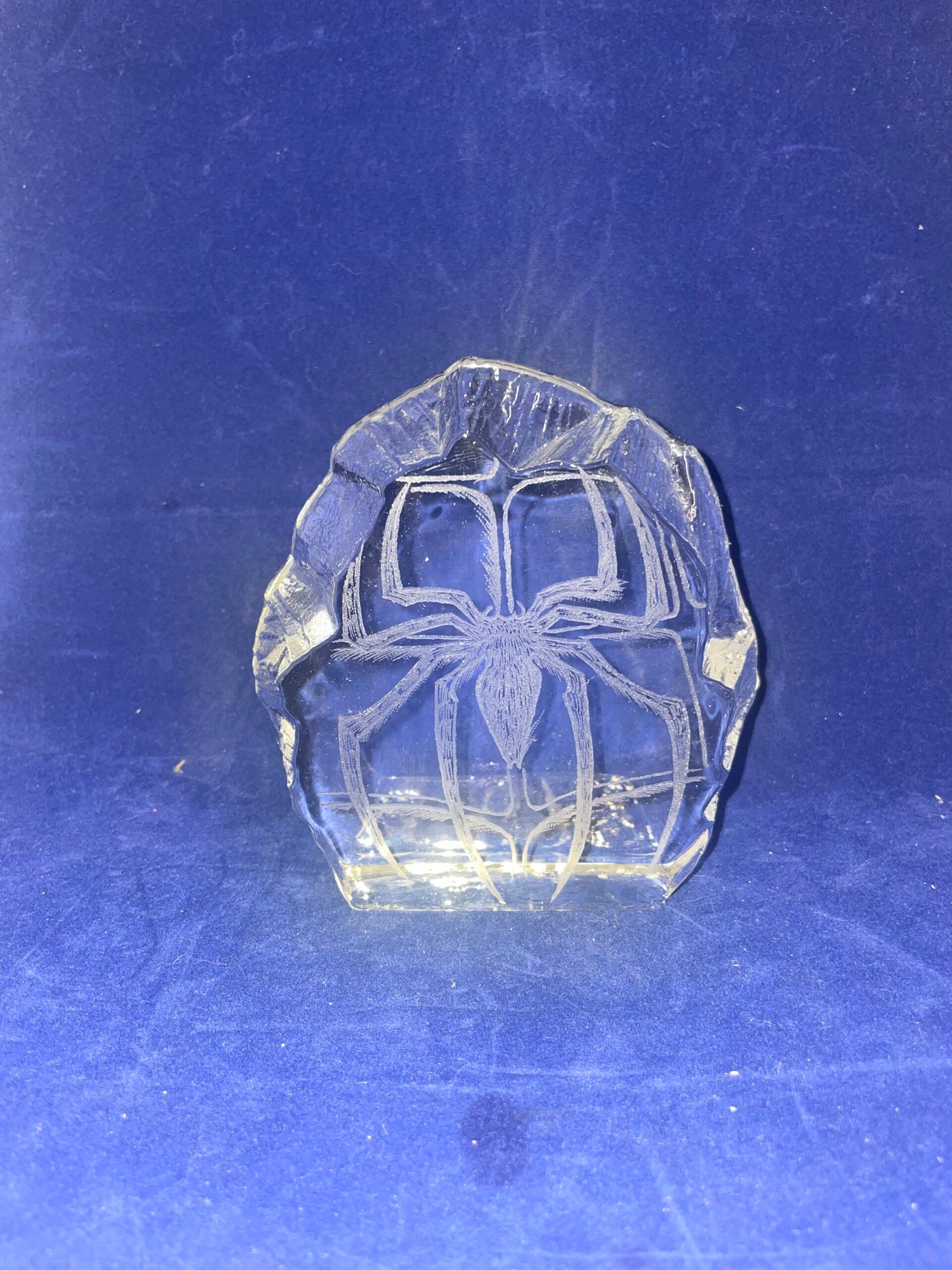 glas skulptur med en spindel in graverat i glaset, Inga skador så skicket är mycket bra